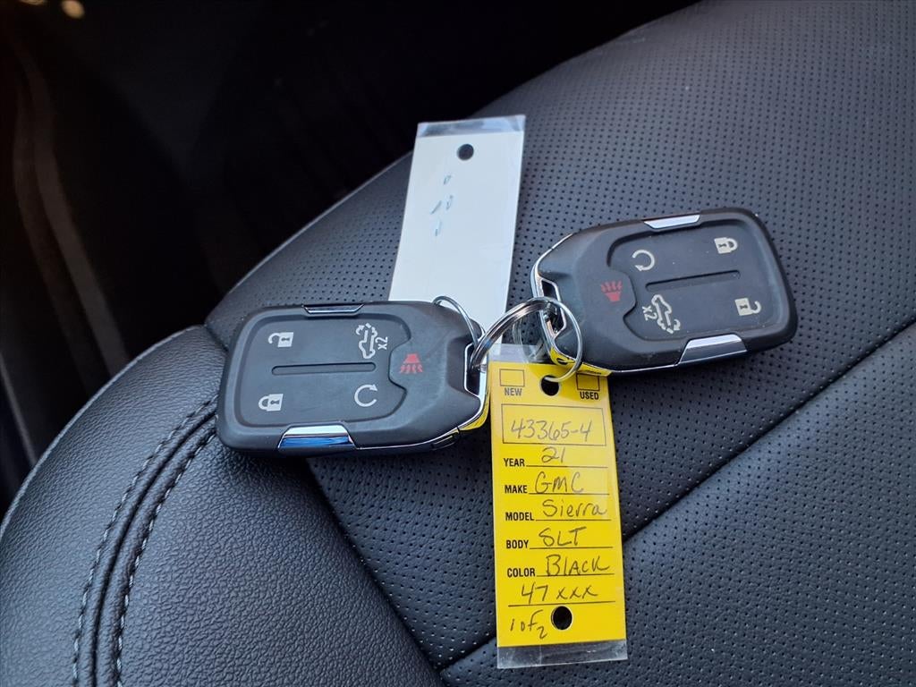 This 2021 GMC Sierra 1500 comes equipped with the following - Preferred Equipment Group 4SA (12-Volt Rear Auxiliary Power Outlet, 120-Volt Bed Mounted Power Outlet, 120-Volt Instrument Panel Power Outlet, 170 Amp Alternator, 4G LTE Wi-Fi Hotspot Capable, Auto-Locking Rear Differential, Auxiliary External Transmission Oil Cooler, Chrome Grille, Color-Keyed Carpeting Floor Covering, Compass, Deep-Tinted Glass, Electric Rear-Window Defogger, Electrical Lock Control Steering Column, Front Frame-Mounted Black Recovery Hooks, GMC Connected Access Capable, Heated Driver & Front Outboard Passenger Seating, Hitch Guidance w/Hitch View, In-Vehicle Trailering App, Integrated Trailer Brake Controller, Keyless Open & Start, LED Cargo Area Lighting, Manual Tilt-Wheel & Telescoping Steering Column, OnStar & GMC Connected Services Capable, Power Door Locks, Power Front Passenger Windows w/Express Up/Down, Power Front Windows w/Driver Express Up/Down, Power Rear Windows w/Express Down, ProGrade Trailering System, Rear Dual USB Charging-Only Ports, Rear Wheelhouse Liners, Remote Vehicle Starter System, Steering Wheel Audio Controls, and Theft Deterrent System (Unauthorized Entry)), SLT Convenience Package (2 USB Ports, 2 USB Ports (1st Row), Floor-Mounted Center Console, Front Bucket Seats, Heated 2nd Row Outboard Seats, Power Sliding Rear Window w/Rear Defogger, Universal Home Remote, and Ventilated Driver & Front Passenger Seats), SLT Premium Package (20 x 9 Polished Aluminum Wheels and Chrome Wheel To Wheel Assist Steps), Trailering Package (Hitch Guidance), 8-Speed Automatic, 4WD, Jet Black Leather, 10-Way Power Driver Seat Adjuster w/Lumbar, 10-Way Power Passenger Seat Adjuster w/Lumbar, 3.23 Rear Axle Ratio, 4-Wheel Disc Brakes, 6 Speakers, 6-Speaker Audio System Feature, ABS brakes, Air Conditioning, Alloy wheels, AM/FM radio: SiriusXM with 360L, Apple CarPlay/Android Auto, Auto-dimming door mirrors, Auto-dimming Rear-View mirror, Automatic temperature control, Brake assist, Bumpers: chrome, Delay-off headlights, Driver door bin, Driver Memory, Driver vanity mirror, Dual front impact airbags, Dual front side impact airbags, Electronic Stability Control, Front 40/20/40 Split-Bench Seat, Front anti-roll bar, Front Center Armrest w/Storage, Front dual zone A/C, Front fog lights, Front License Plate Kit, Front reading lights, Front wheel independent suspension, Fully automatic headlights, Heated door mirrors, Heated front seats, Heated steering wheel, Heavy Duty Suspension, Illuminated entry, Low tire pressure warning, Memory seat, Not Equipped w/Dynamic Fuel Management, Occupant sensing airbag, Outside temperature display, Overhead airbag, Overhead console, Panic alarm, Passenger door bin, Passenger vanity mirror, Perf Leather-Appointed Front Outboard Seat Trim, Power door mirrors, Power driver seat, Power passenger seat, Power steering, Power windows, Premium audio system: GMC Infotainment System, Radio data system, Radio: Premium GMC Infotainment Sys w/Multi-Touch, Rear reading lights, Rear seat center armrest, Rear step bumper, Rear window defroster, Remote keyless entry, Security system, SiriusXM w/360L, Speed control, Speed-sensing steering, Split folding rear seat, Steering wheel mounted audio controls, Tachometer, Telescoping steering wheel, Tilt steering wheel, Traction control, Trip computer, Variably intermittent wipers, Voltmeter, and Wheels: 18 x 8.5 6-Spoke Machined Aluminum.